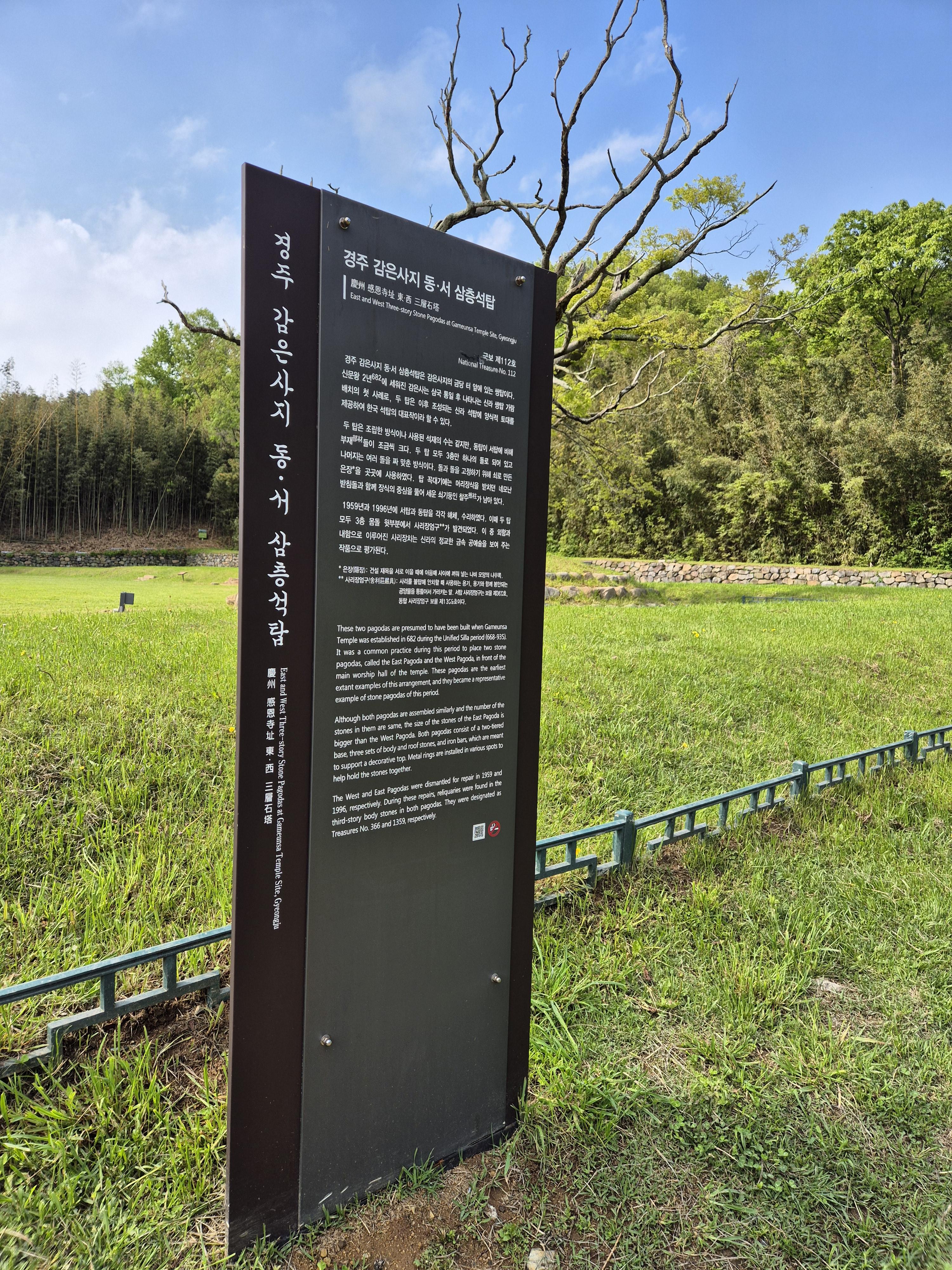 문무대왕릉에서 경주의 동해바다를 보고 아름다운 풍경을 즐기고 나면 차로 5분거리에 감은사지도 들렸다.감은사가 있었던 절터인데 이제 절은 사라지고 남아있는 터 및 초석과 쌍탑을 볼 수 있었다. 그냥 절터구나 쌍탑이구나하고 보았는데 포스팅을 하는 지금 궁금해져서 검색해보니 감은사지 동서삼층석탑은 국보 제112호라고 한다 . 신라시대때는 감은사까지 물이들어왔는지 물길도 나있다고 한다.
